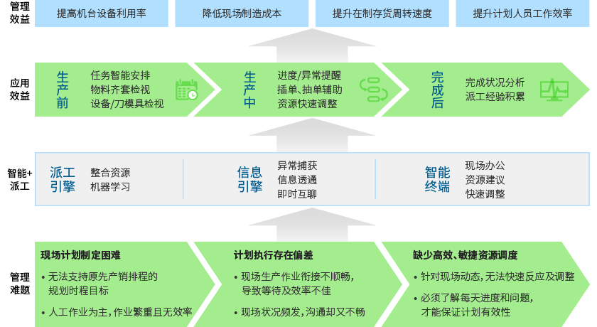 智能派工依据生产日排程规划基础现场资源的实务状况进行高效有序的现场生产工作的调度及安排,以期能如期如质达成现场执行计划产出目标及提高现场设备及资源的生产效率。