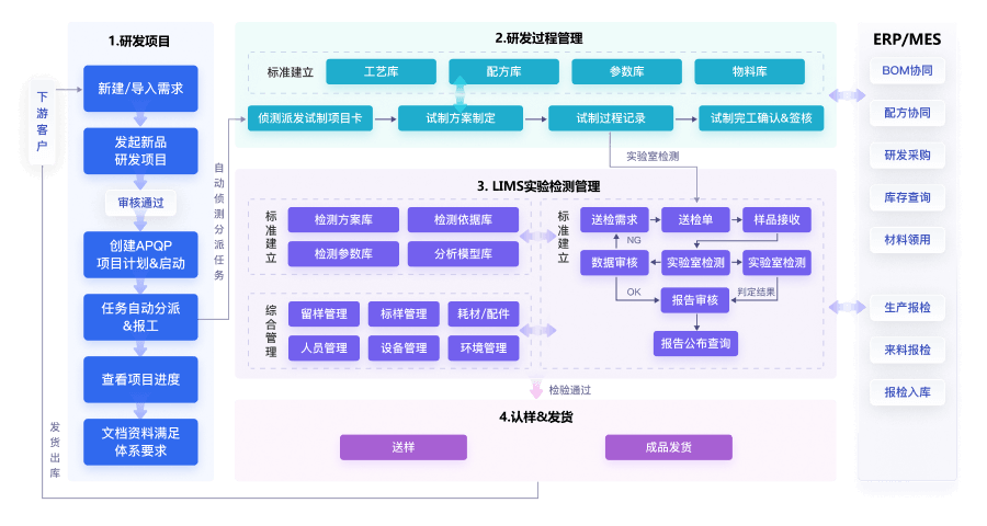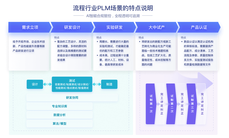 流程行业PLM解决方案涵盖研发过程管理LIMS实验检测管理,融合ERP和 MES系统,在项目合规管理、