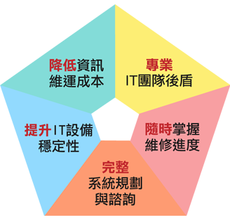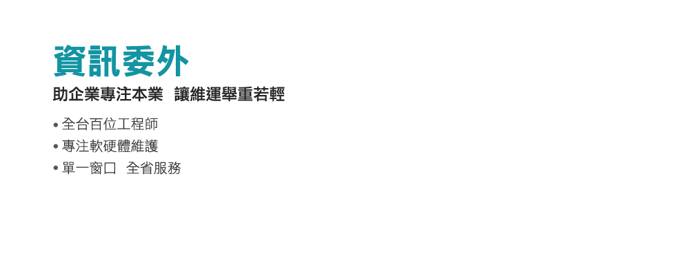 A1:「專注核心本業,提升企業競爭力」!企業將非專長之資訊事務委由專業廠商處理,得以提升IT設備穩定性、實現高品質低成本的經營模式。資訊事務與企業內部經營管理息息相關,但資訊技術進步快、變動大,企業自己完全掌握的代價太大。資訊委外能免除額外聘請專業人員的成本,僅需負擔少許費用,即能夠快速取得資訊解決方案,無需擔心資訊設備的維運問題;更不必花費心思去管理或培育資訊人員,大幅降低資訊系統維運的成本及複雜度;並達成藉此減少年度資訊預算的目的。