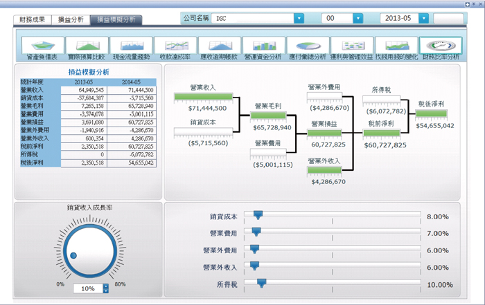 BI商業智慧系統:財務分析資訊提供各階層決策者多維度分析。五力分析及財務槓桿分析,以圖表型態呈現讓使用者更容易閱讀。