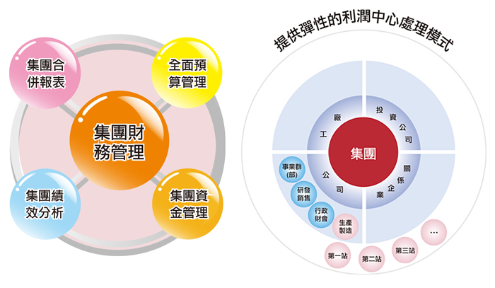 - 利潤中心管理,可單一或合併不同事業體財務報表