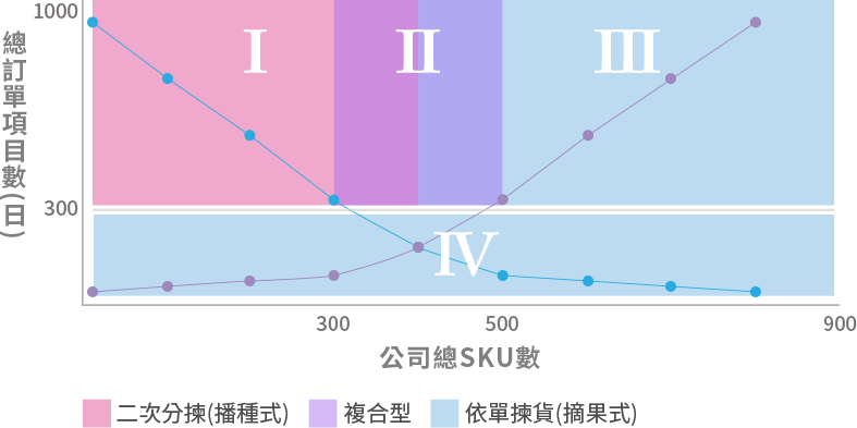 選擇合適的揀貨方式和技術,能夠提高揀貨效率和準確率,進而提高整個高效儲運系統的運作效能,大部分的企業選擇的都是人隨物走的揀貨方式,人隨物走的2種常用的揀貨分別為摘果式與撥種式,以下以每筆訂單項目數和SKU數來做選擇建議: