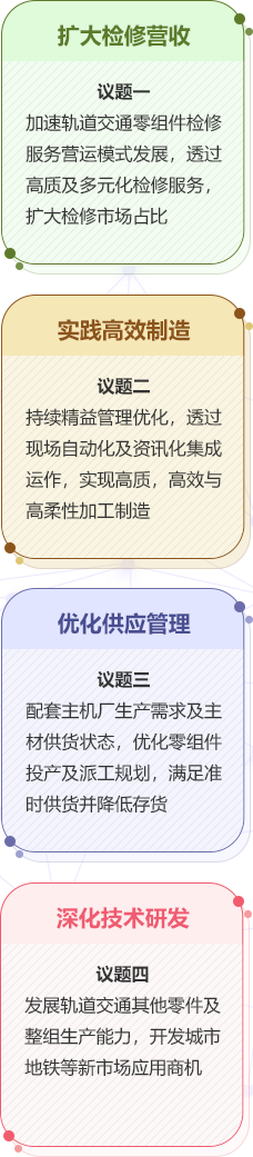 加速轨道交通零组件检修服务营运模式发展,透过高质及多元化检修服务,扩大检修市场占比