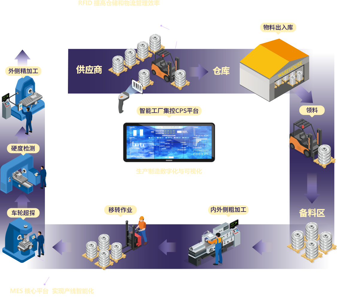 从物料入场开始,从库房物料之间调拨到物料出库上生产线(何时上机台、何时开始加工等,上了机台后何时开始加工、加工 结束,何时下料),还有生产过程中每一道序运转,如何透由RFID进行监控。